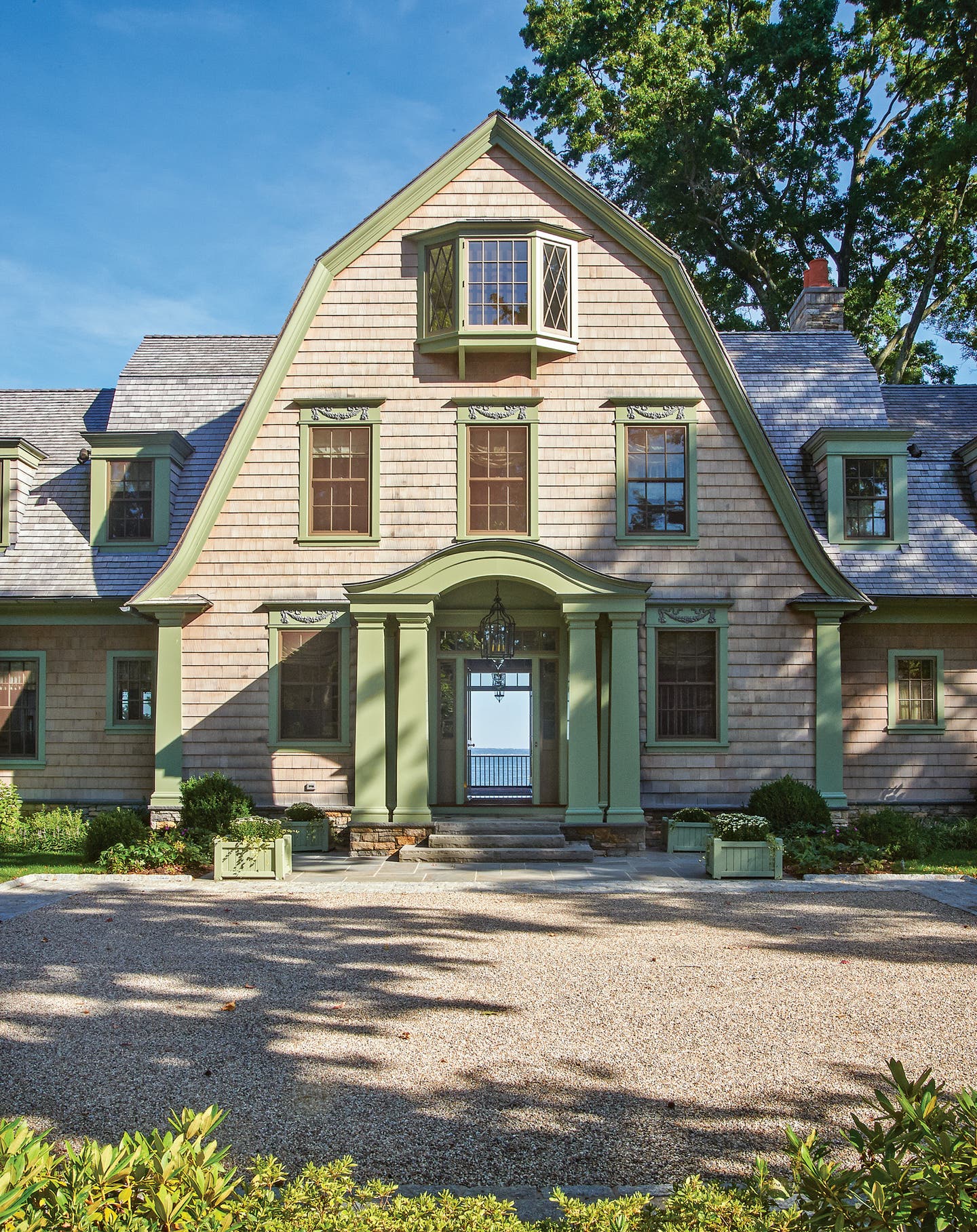 Set back from the street and positioned about six feet above the grade, the award-winning home greets visitors in gracious style, appearing smaller than it actually is. “On the street side, we’re hiding the massing,” Patterson says. Working with the builder, Paul Tallman of Tallman Building Company in Fairfield, Connecticut, Patterson and the project manager, Gabriella Albini, took care to save old-growth maple and oak trees, giving the home a longstanding air.