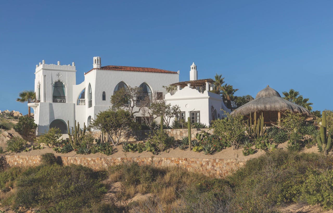 A second primary suite that looks toward the sea is crowned by a breakfast terrace and a shaded dining pergola that’s connected to the kitchen. A pool stretches toward the view, and a woven palm-roof palapa offers a respite from the desert sun.