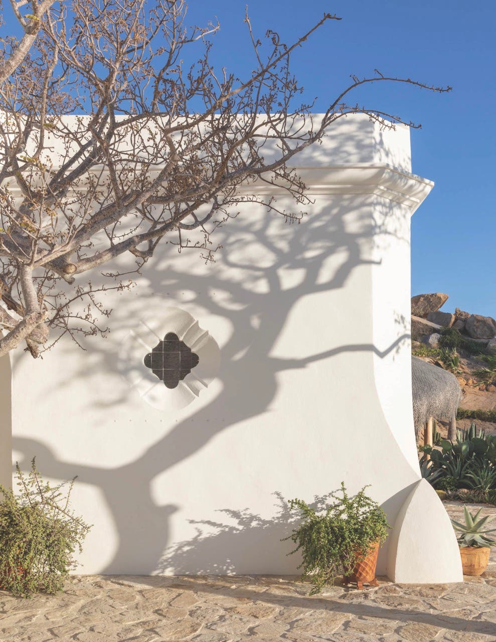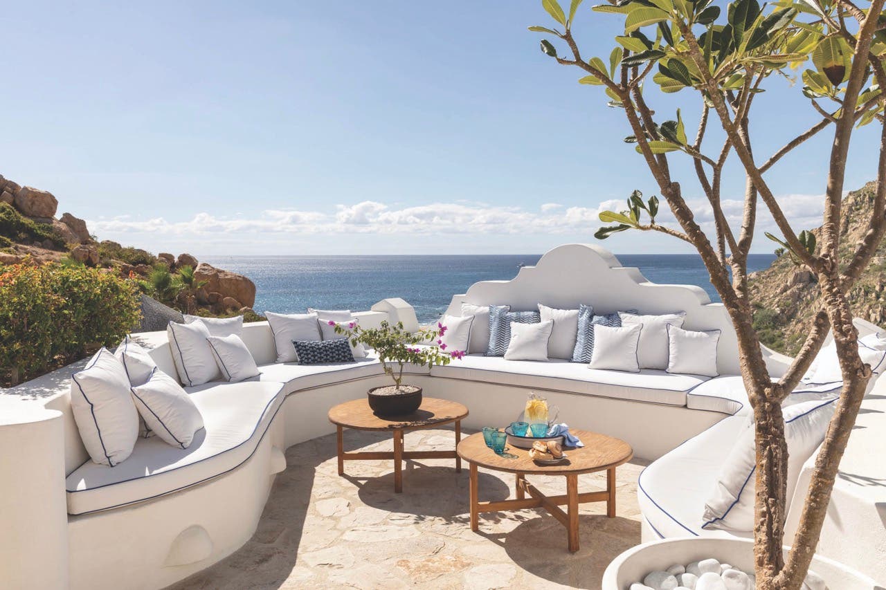 The primary suite is housed in a tower—the tower, Imber says, was the client’s’ idea—that’s hollowed at the base to contain a grotto and treats the eye to sweeping views of the Sierra da La Laguna Mountains that stretch to the sea. It’s topped by a sunset cocktail terrace.