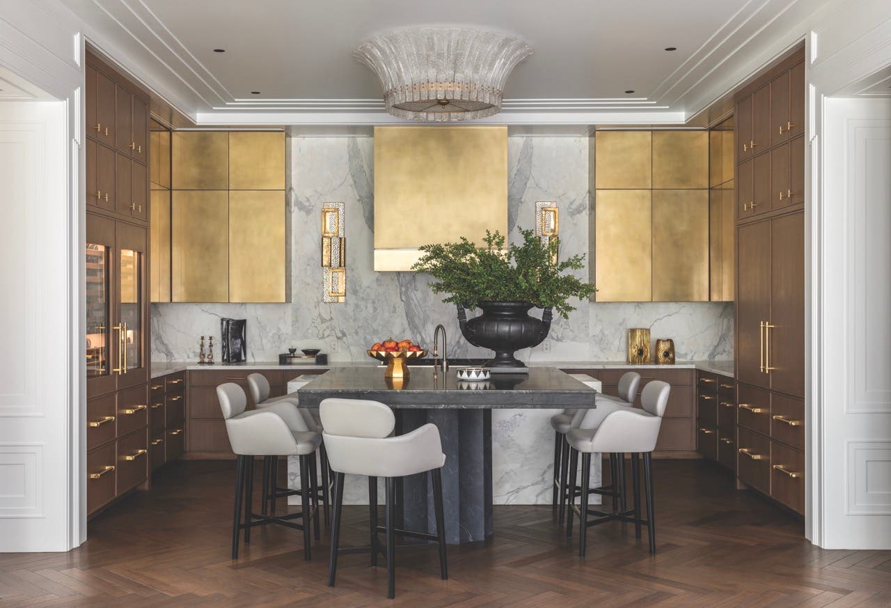 The kitchen’s molding is more pared back than the formal spaces, giving the room a more contemporary look. It gets its glam from cabinets that are wrapped in patinaed and lacquered brass, an island/table that looks like a raised altar, and a two-sided sofa centered in the atrium space that serves as a bridge between it and the family room.