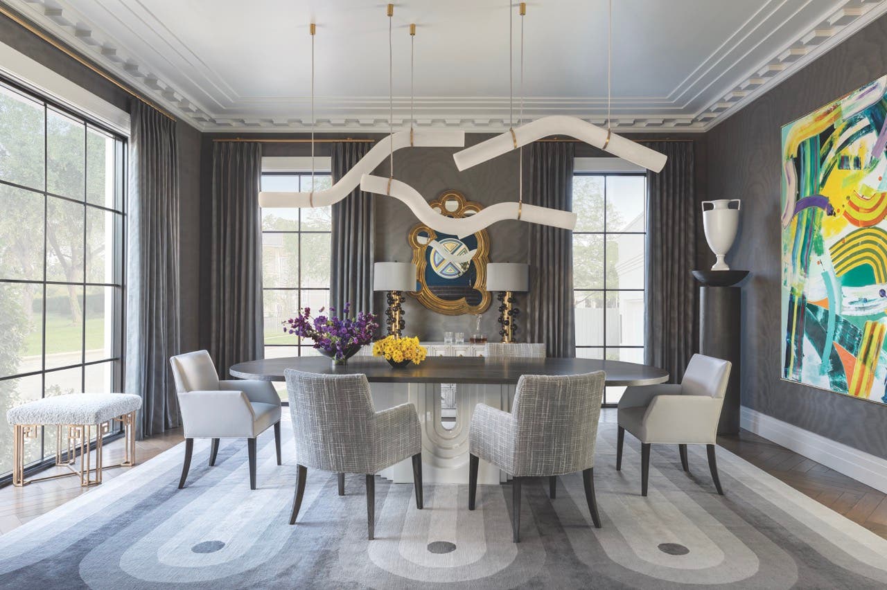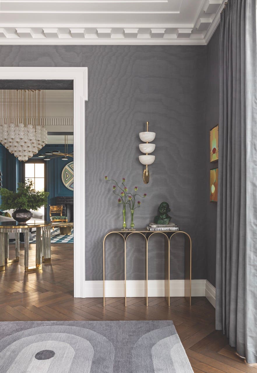 The dining room, its walls clad in large-scale silk moiré in a gray hue, is more muted. Like the living room, the colorful artwork takes center stage, becoming a conversation piece for those gathered around the table Johnston designed, whose arches are echoed in the rug that’s also of his design.