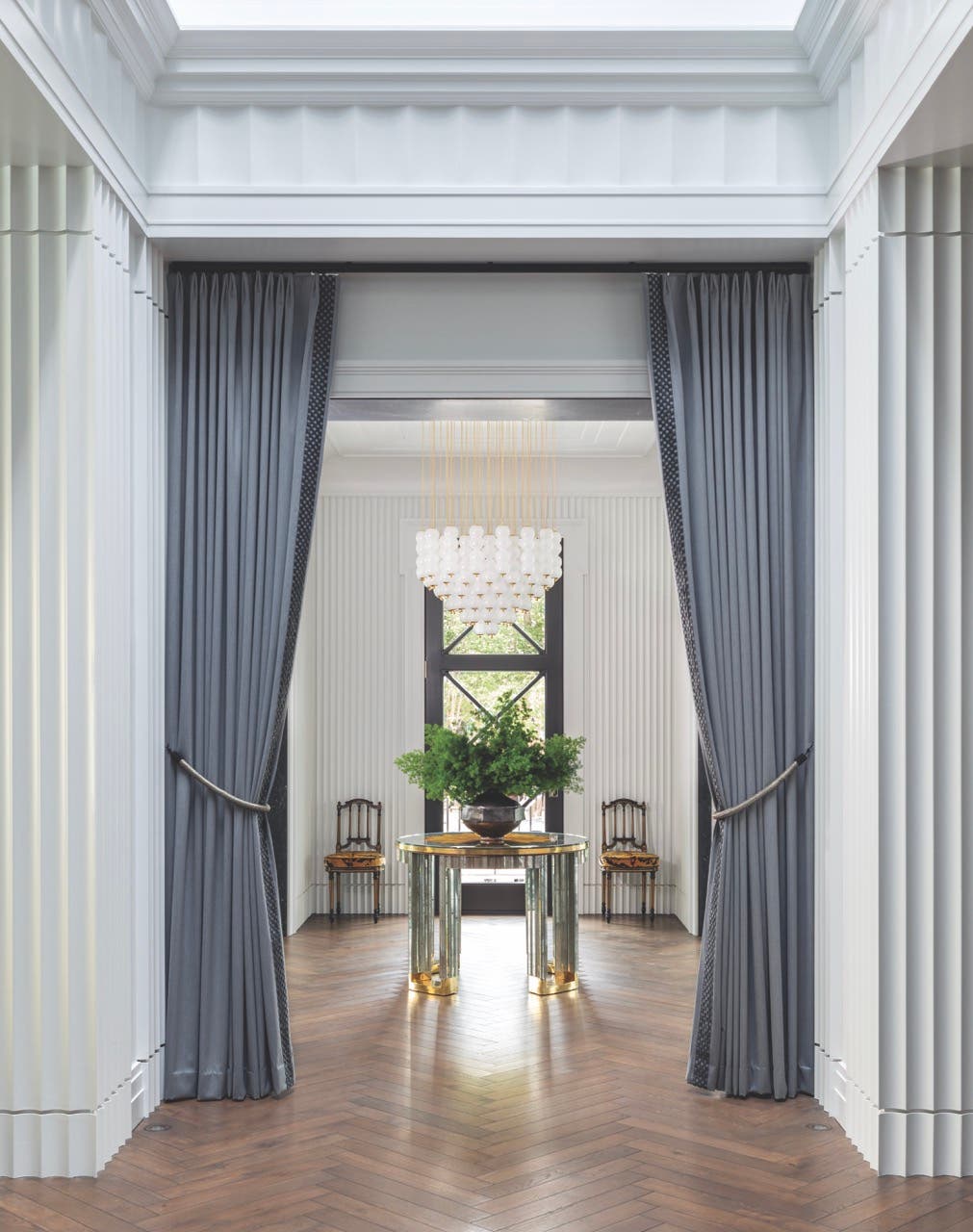 The spaces, hints of which are visible through the large glass front door, have a decided theatrical flair. Long, lush portières that are reminiscent of a stage curtain lead the way to the main rooms.