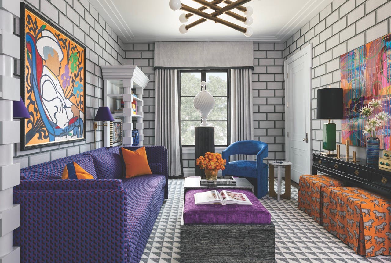 Perhaps the most fanciful space is the library, whose wallcovering resembling rusticated stone was designed by Johnston, turning the room into a playful castle. A purple sofa and a pair of orange ottomans with a dancing-horse motif are juxtaposed with more serious-looking Neoclassical bookcases.