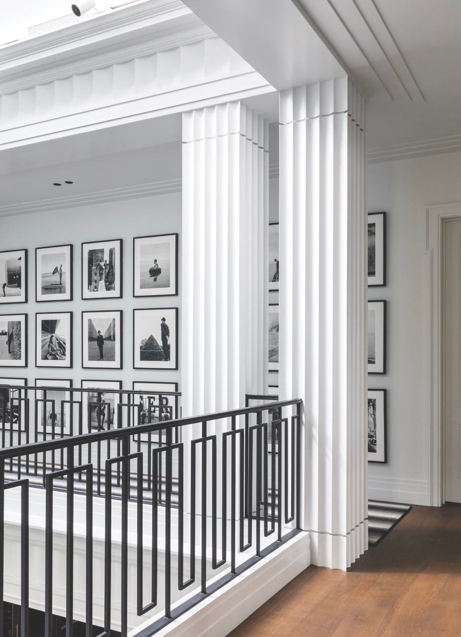 The central staircase at the rear of the home, defined by a black banister, sets the stage for more art: On the second-floor landing, an installation by artist John Cornu that is meant to recall burnt matchsticks is opposite a collection of 27 framed black-and-white prints by legendary New York City photographer Rodney Smith.