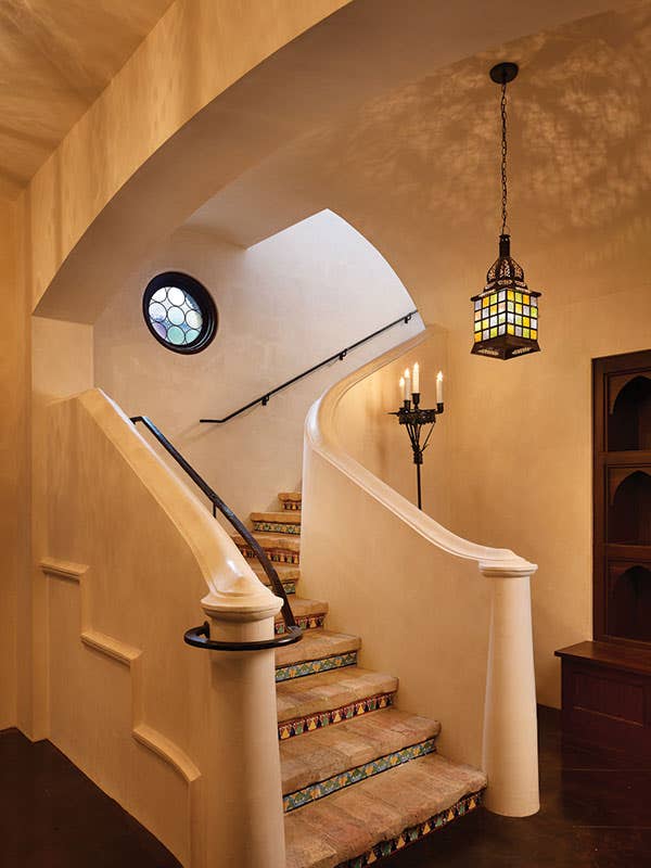 While the owners had the future in mind, they also wanted a comfortable place to live. “They like to entertain,” says Imber, “so it was important to make this a place that felt inviting and that opened up to the outdoors.” Visitors are enveloped in exoticism at the front entry, where a Spanish-inspired zaguán with wooden doors opens to an enchanting Cosmatesque tiled foyer, where the water of a fountain plays a soft background melody of welcome. The space links to two stairways that lead to the lower level, and a large leaded-glass window in muted colors ushers in soft light to the library/study of the master suite below.