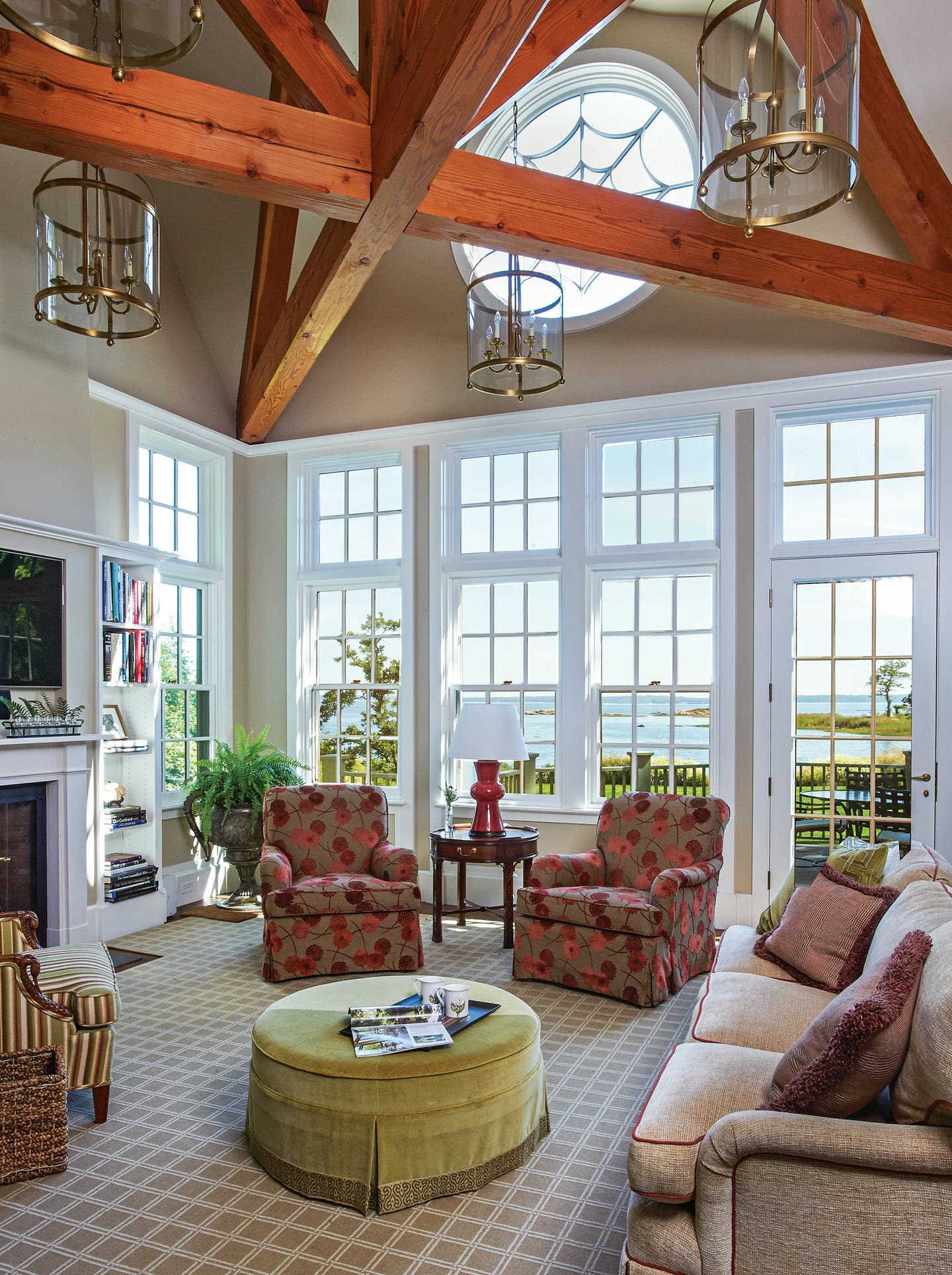 The couple brought their dream to Patterson: a home that would be cozy enough for the two of them, but large enough to accommodate their children and grandchildren, who visit for several weeks in the summer, spending long days swimming, sailing, and kayaking. They also wanted space to hang their art collection. Overall, a relaxed air was important to them, but so was elegance. “It was all about getting the right proportion of house to fit their program and fit on the lot, and not make the lot look small,” Patterson says. The gambrel rooflines of the 6,100-square-foot home gave Patterson a way to “sneak in some attic space,” which houses a children’s playroom, as well as storage.