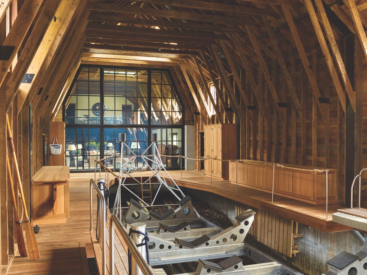 “We didn’t want to cut the space in half with a wall,” Schafer says. “With the glass wall, you never lose the feeling of the full length of the boathouse, and it becomes a cathedral-like space. You can look into the harbor from the mezzanine. The wall is waterproof, and the doors in it are raised off the ground just like they would be in a ship so the water doesn’t flow in.”