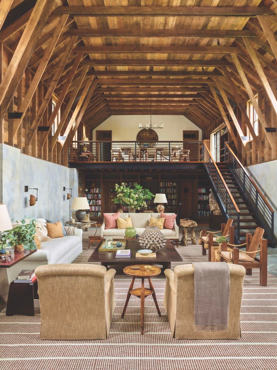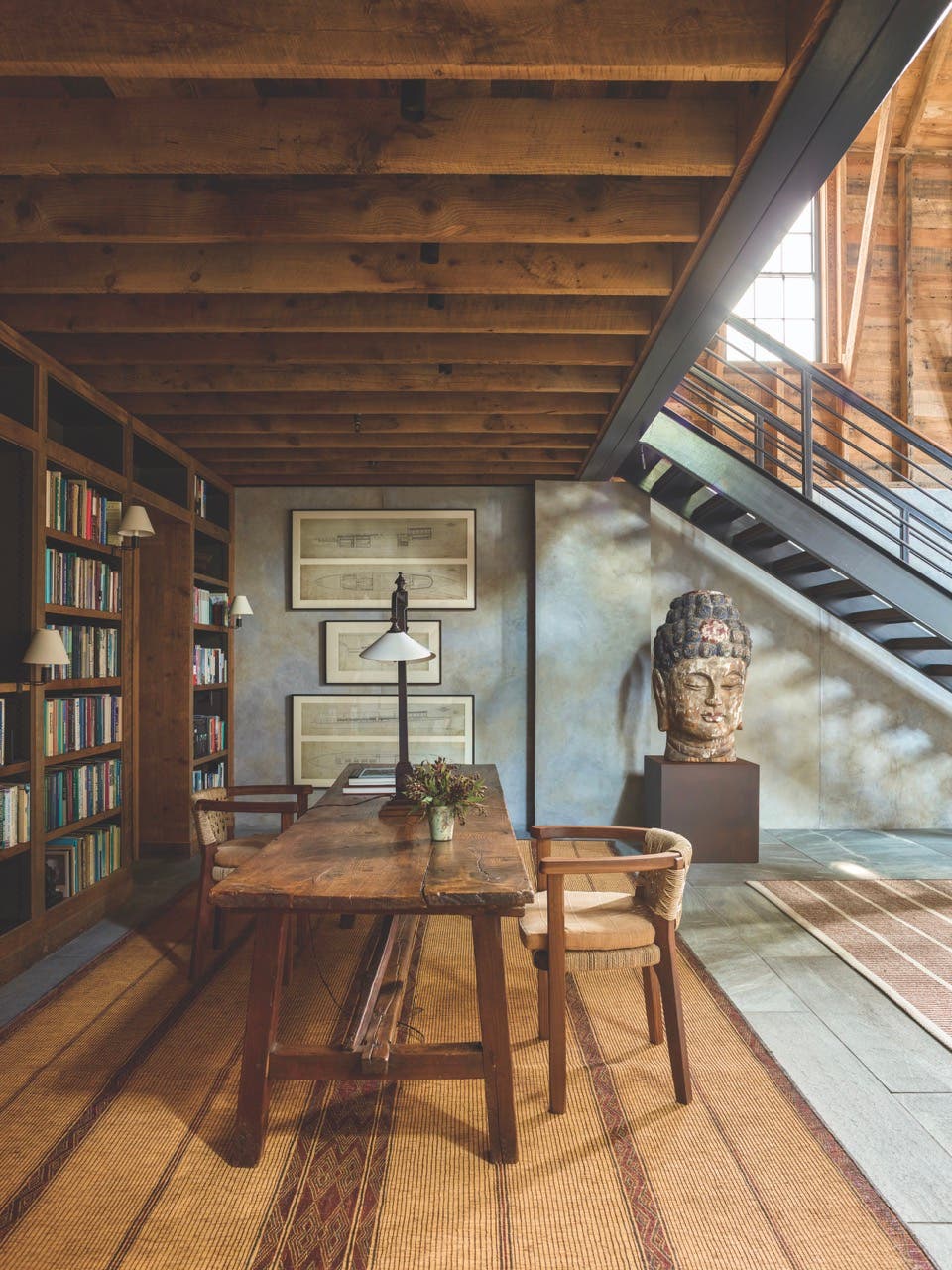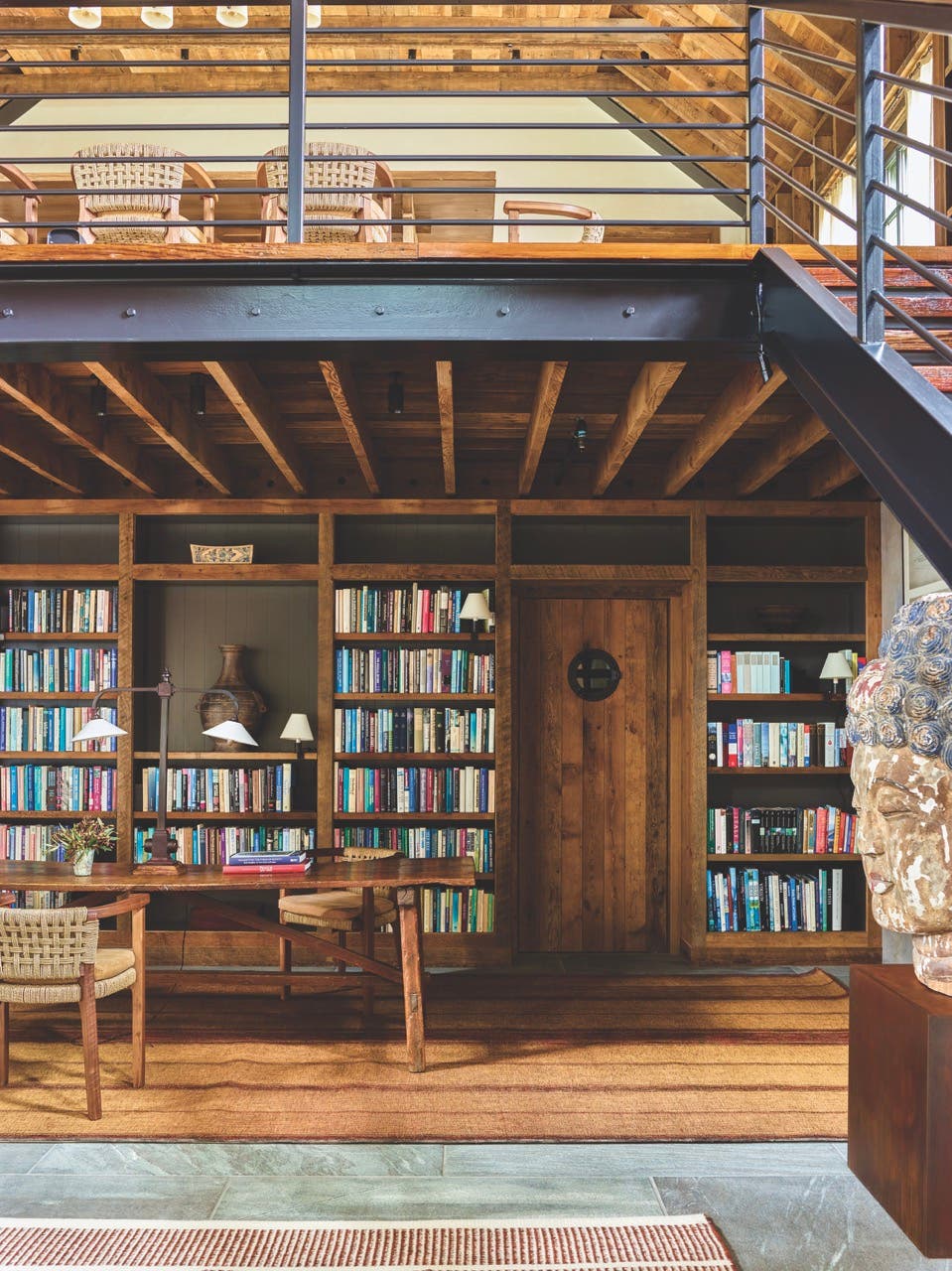 A library alcove, tucked under the mezzanine like a baby in a blanket, features books collected by the owners and millwork from the same reclaimed hemlock as the rest of the interior.