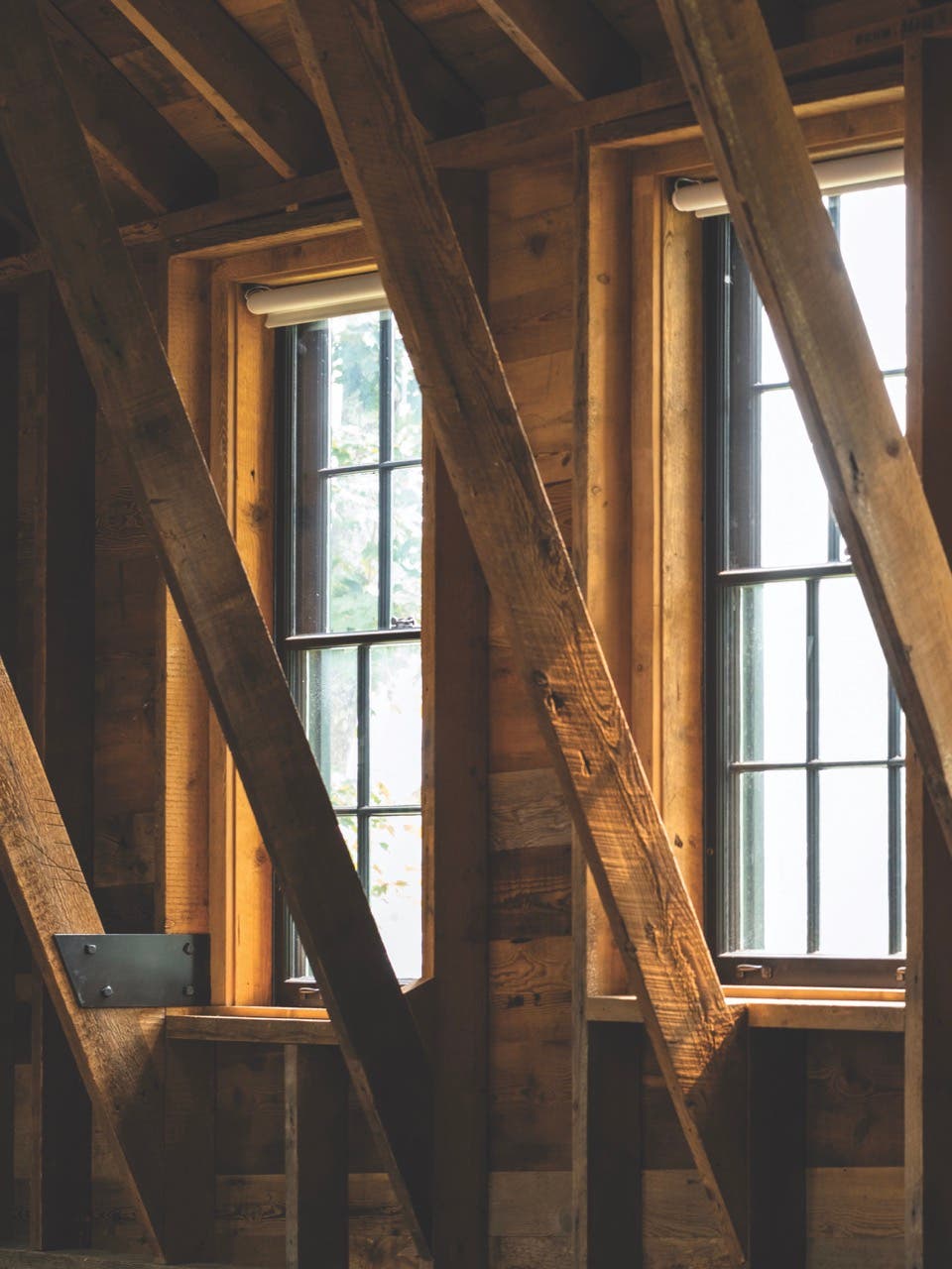 “We took great care to preserve the architectural character of the original interior,” Schafer says. “This was accomplished by salvaging as much of the original interior woodwork as possible and reusing it in the restored interior and matching it with reclaimed beams and boards of a similar species—in this case hemlock—wherever new wood was required.”