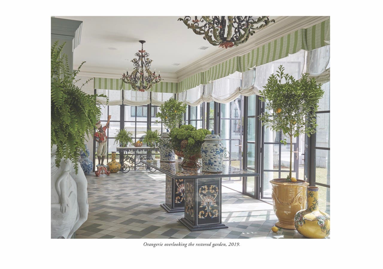 In addition to having space for six vehicles and electrical charging stations, the new 3,700-square-foot structure houses an orangerie that’s used for entertaining. Its top floor has a terrace that overlooks the mansion’s sculpture garden and Forsyth Park, a 32-acre public green space.